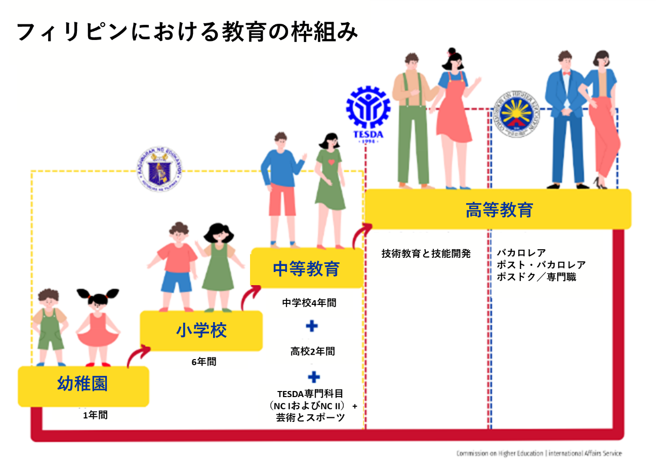 幼稚園1年、小学校6年、中学校4年、高校2年の教育を経て、フィリピン労働雇用省技術教育技能教育庁(The Technical Education and Skills Development Authority:TESDA)が行うトレーニングプログラム、もしくは大学に進みます。