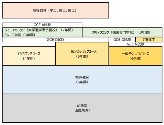 中等教育後、ジュニアカレッジに進学した学生は2年間でGCE Aレベル試験(General Certificate of Education Advanced Level)を受けて大学進学資格を取得し、高等教育機関で学士、修士、博士課程まで進むことができます。ポリテクニックに進学した学生は実践的な職業訓練を受け、多くの場合卒業後すぐに就職しますが、優秀な成績を収めた場合は大学への編入も可能です。