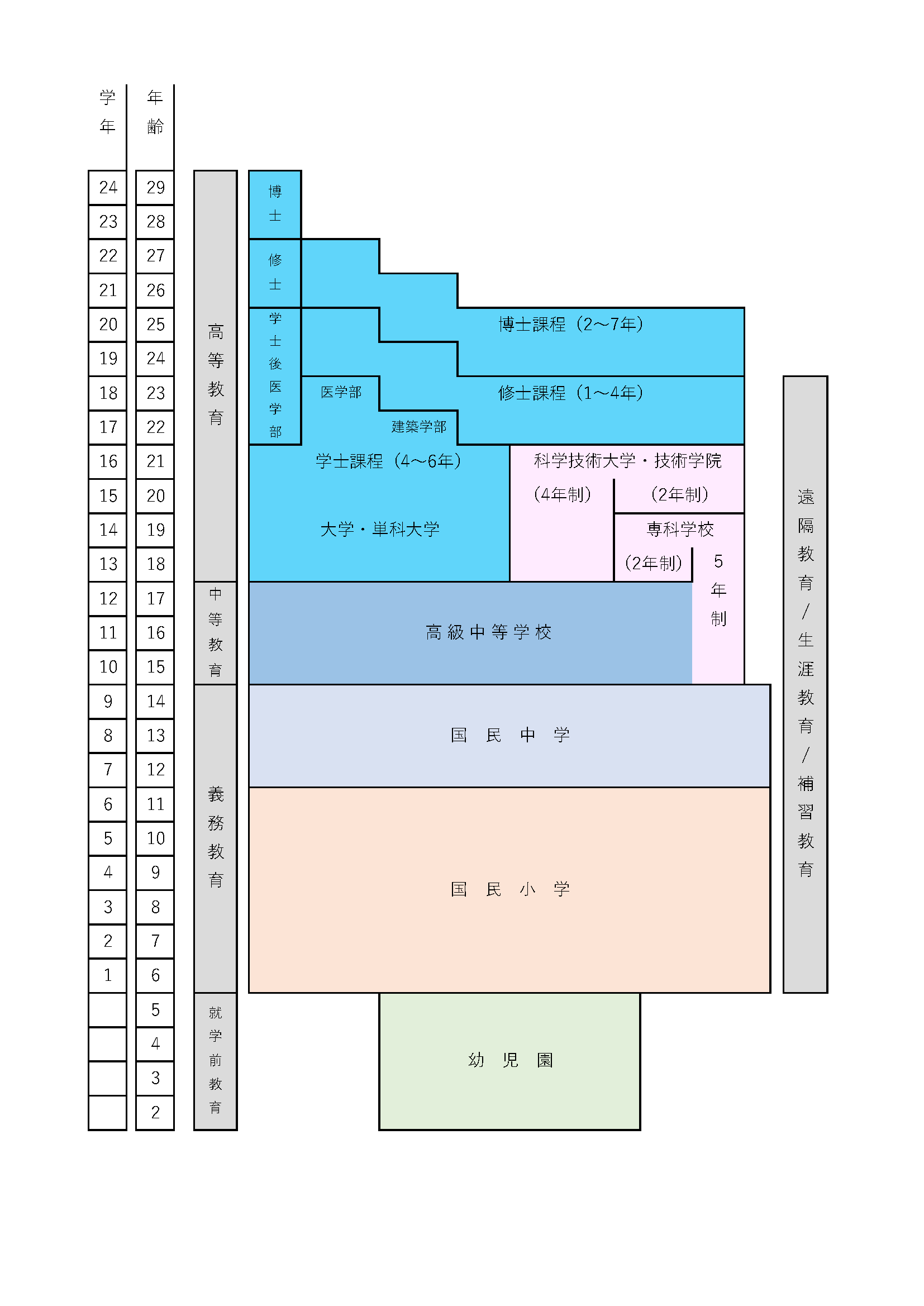 後期中等教育以降は、「普通教育」と「技術および職業教育」の2つに大別されます。国民中学卒業後、学生は普通型高級中等学校(高校に相当)、技術型高級中等学校(専門学校に相当)、五年制専科学校へ進みます。普通型高級中等学校を卒業した学生は高等教育機関の大学へ進学します。大学の学士課程は4~6年間、修士課程は1~4年間、博士課程は2~7年間です。技術型高級中等学校を卒業後は、高等教育機関の二年制専科学校、四年制技術学院、科技大学へ進学できます。