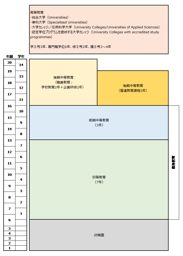ノルウェーの教育制度では、6歳から16歳までの10年間が義務教育となっており、小学校に7年間、中学校に3年間通学します。その後、高等学校に進学し、普通教育または職業教育のいずれかを選択。さらに、所定の成績を収め、試験に合格することで総合大学、単科大学などの高等教育機関への入学資格が与えられます。欧州単位互換制度(ECTS)を採用し、特に欧州での単位互換性が高いのが特徴です。