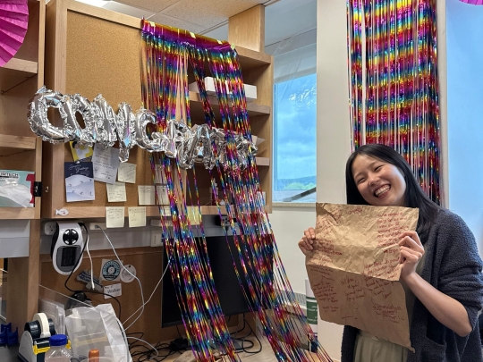 一番大変だったのは、新しい研究室で新しい指導教員のもと、Qualifying Exam に臨んだことでした。私は指導教員にとって初めての博士課程の学生であり、私自身も指導教員も、試験がどのようなものになるのか全く予想がつきませんでした。自分で自分にプレッシャーをかけてしまう性格に加え、研究室の先輩でQualifying Exam を受けた人がいなかったため、参考にできる前例がないことも大きな不安要素でした。それでもなんとか乗り越え、振り返ってみれば、結局あらゆる質問に備えることなど不可能だったと気づきました。次に試験を受ける研究室の後輩には、不安になりすぎて睡眠を削るようなことはしないようにと伝えています(笑)